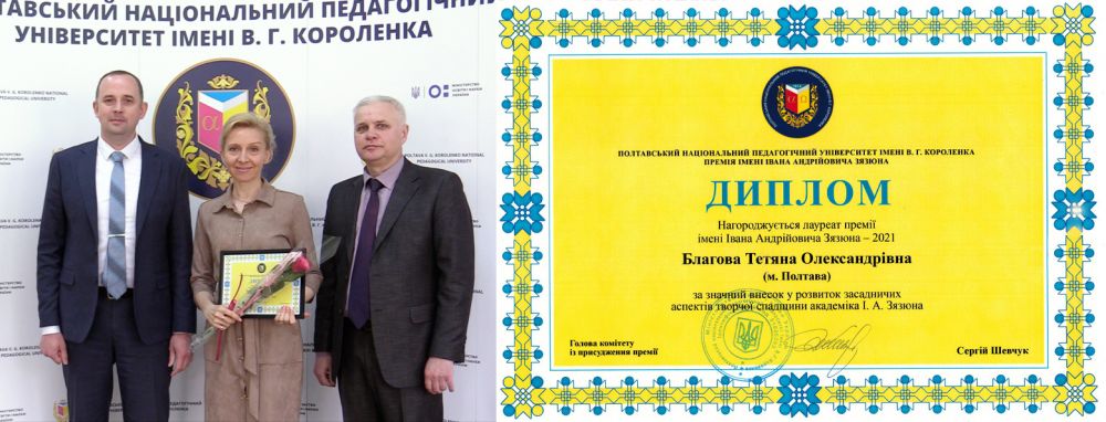 Вчена рада Полтавського національного педагогічного університету імені В. Г. Короленка заснувала премію на пошанування академіка І. А. Зязюна з метою популяризації його науково-педагогічного набутку, а також задля підтримки наукових досліджень психолого-педагогічного й етико-естетичного напрямів. Згідно рішення Конкурсного комітету переможницею Премії імені Івана Андрійовича Зязюна визнано завідувачку кафедри хореографії ПНПУ імені В.Г. Короленка, кандидатку педагогічних наук, доцентку, члена Національної хореографічної спілки України Тетяну Благову.