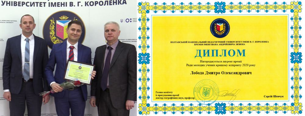 Премію кращого аспіранта 2020 р. присуджено аспіранту кафедри загальної педагогіки та андрагогіки, старшому лаборанту і асистенту кафедри всесвітньої історії та методики викладання історії Дмитру Лободі.
